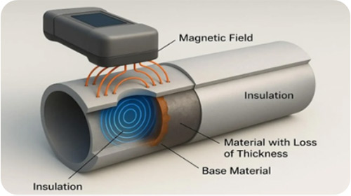 Pulsed Eddy Current (PEC) is a non-destructive electromagnetic technique used to measure wall thickness through insulation, coatings, or cladding—without removing insulation or requiring bare metal contact. It is ideal for quantifying corrosion under insulation (CUI) after an area of concern has been flagged by broader screening tools.